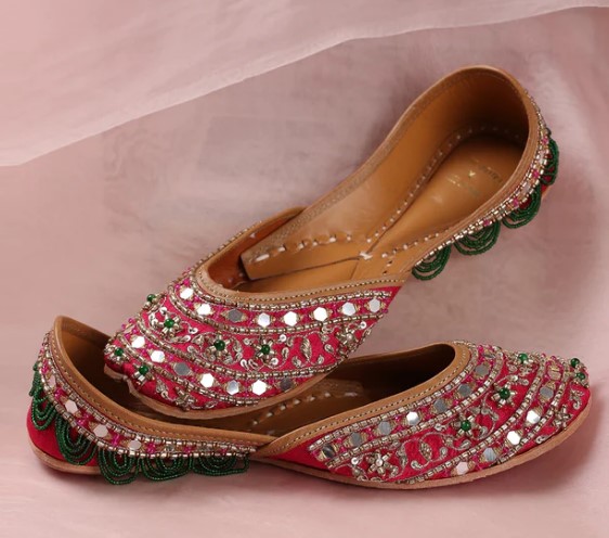Details & Fit: Upper: Upper: Deep Pink Dupion Silk Embellishments: Classic Ridhi Mehra jewel embroidery with multicolour gem-stones, pearls, resham thread zardozi, mirror work, beads and moti. Leather Lining & Pure Leather Sole. Comes in a Ridhi Mehra x House of Vian Dust Bag & Luxury Shoe Box.