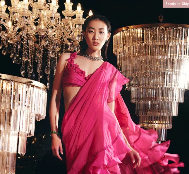 Bright fucshia thread embroidered net blouse with Chiffon organza Double draped ruffle saree
